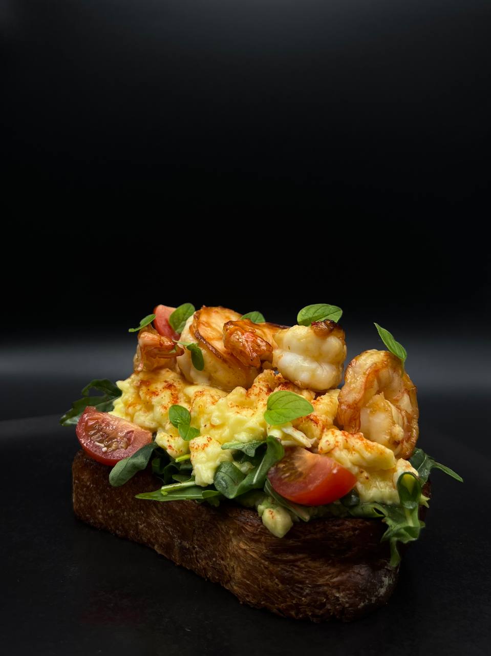 Булочка бріош, авокадо, масло вершкове, рукола, помідор чері, тигрова креветка, яйце куряче, мікрогрін, соус світ чилі, сіль, паприка копчена