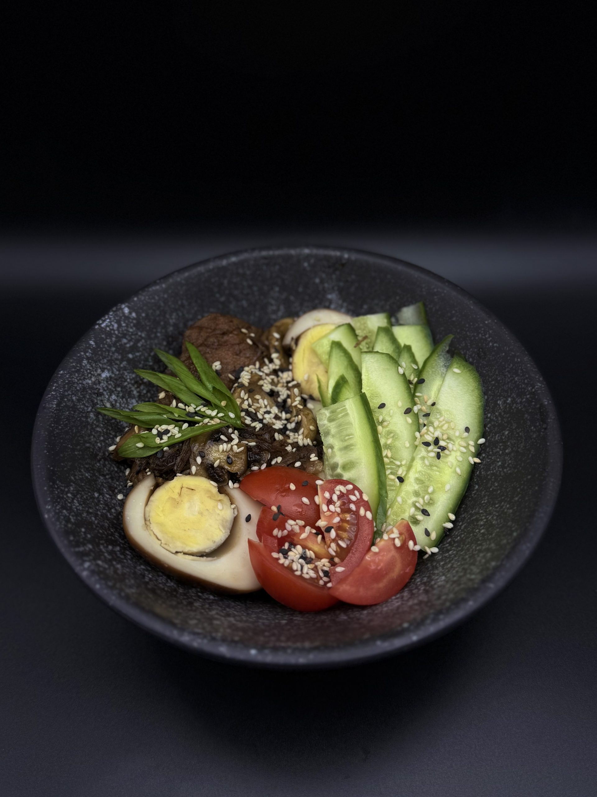 Рис, томлена свинина в соусі тереякі, печериці в соусі тереякі, яйце, помідор чері, огірок, зелена цибуля, кунжутно-соєвий соус