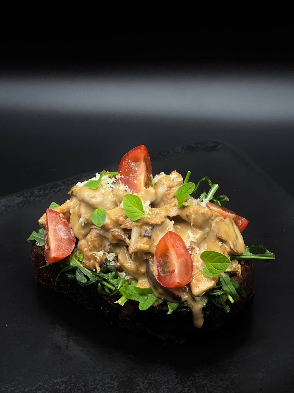 Булочка бріош, авокадо, масло вершкове, пармезан, помідор чері, сіль, куряче філе, печериці, фіолетова цибуля, вершки, соєвий соус, рукола